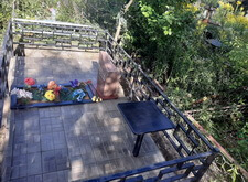 Когда подготовительные работы были окончательно завершены, мы уложили территорию участка геотекстилем, предварительно прорезав в нём отверстие для столика.