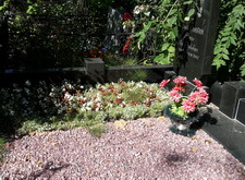 Очередная ежемесячная уборка на могиле. За прошедшее время с последней уборки были дожди. Растения стили гуще, сорняки тоже. Пыли на граните тоже не мало, особенно со стороны дороги.